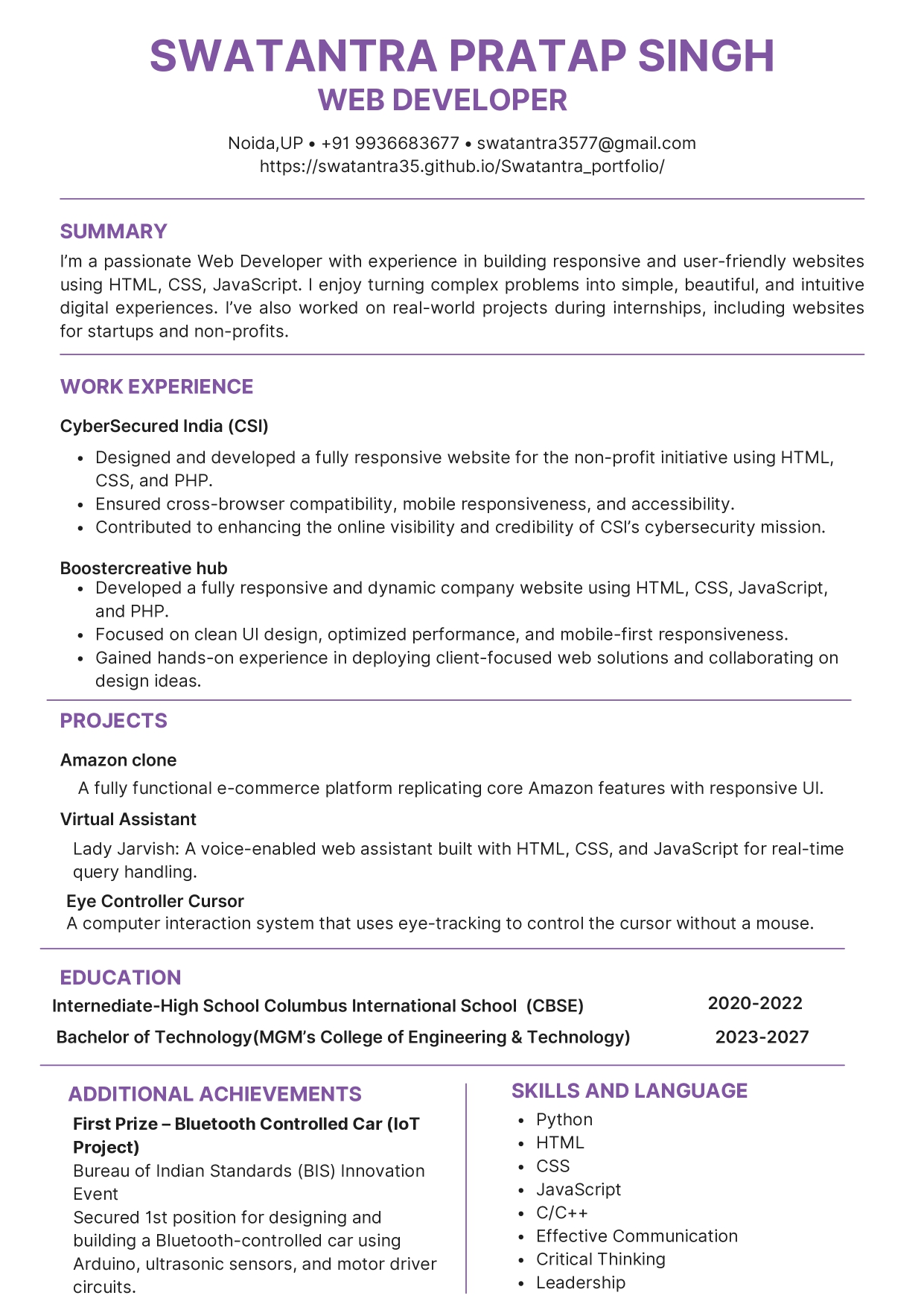 Hello! I'm Swatantra, a passionate and dedicated web developer with a keen eye for detail and a love for coding. With a strong foundation in HTML, CSS, JavaScript, and Python, I have the skills to bring innovative ideas to life and create dynamic, user-friendly websites and applications.